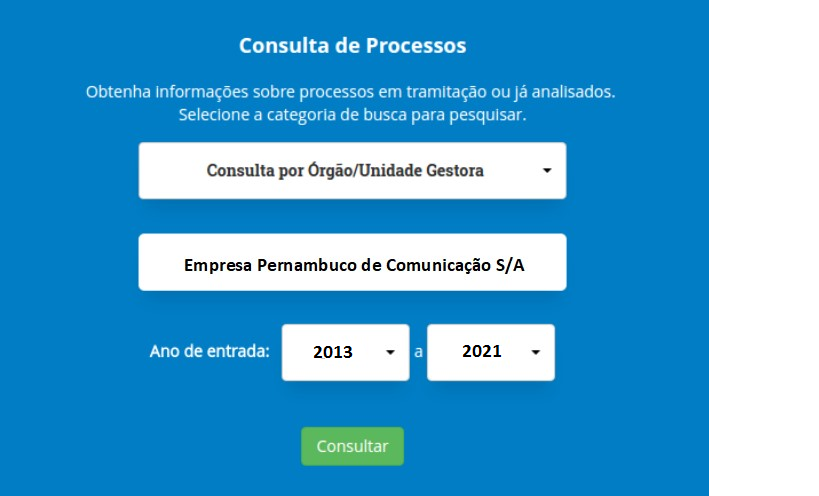 Para obter informações referentes ao resultado de inspeções, auditorias, prestação ou tomada de contas realizadas na Empresa Pernambuco de Comunicação – EPC – através do Tribunal de Contas do Estado, clique aqui, selecionando a opção de pesquisa “por órgão / unidade gestora” e indicando esta empresa como objeto de sua pesquisa. Siga os passos abaixo: