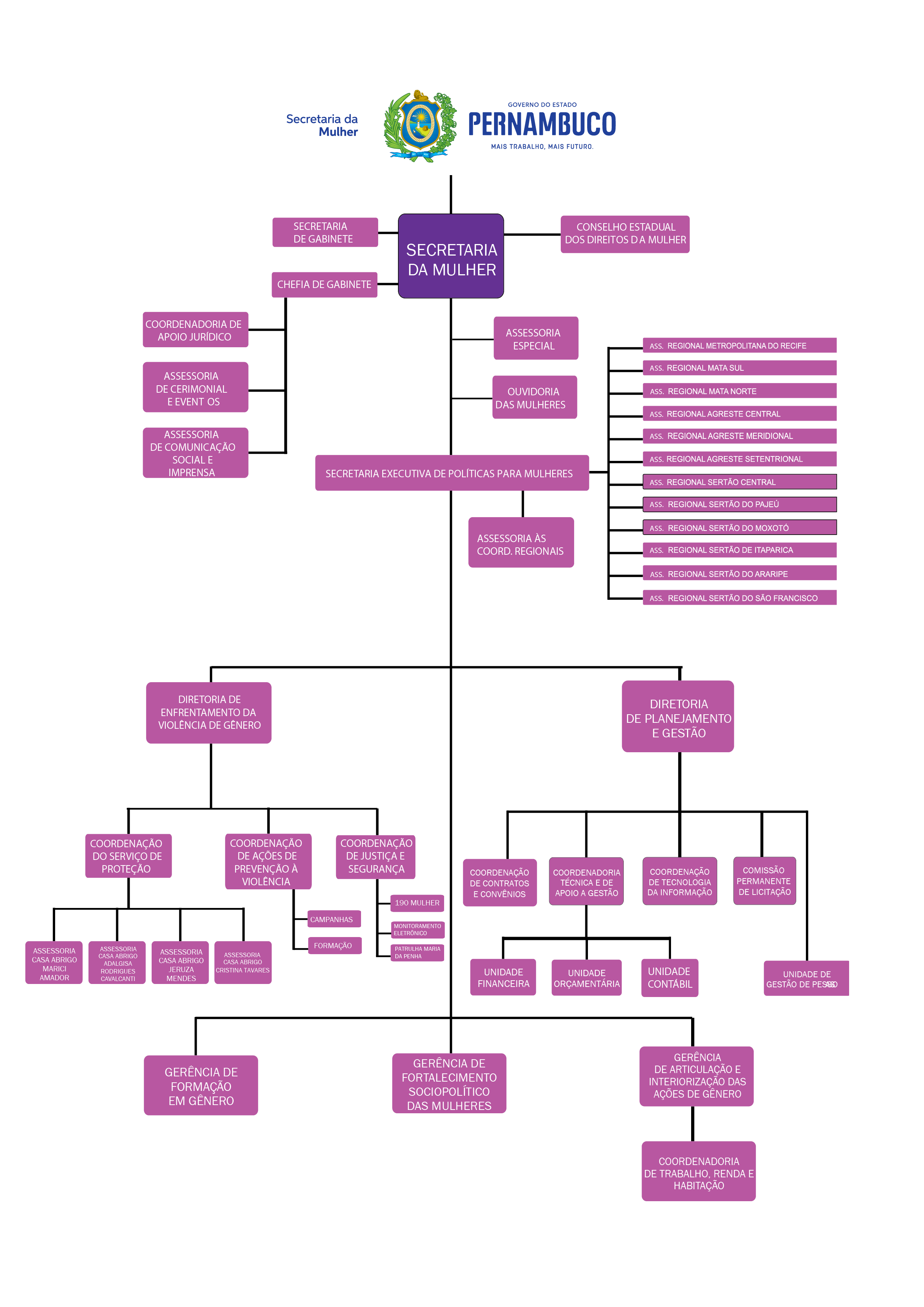 Apresentamos a seguir a Estrutura Organizacional da Secretaria da Mulher de Pernambuco (SecMulher-PE), representada em formato de Organograma, conforme a Lei N° 16.520, de 27 de dezembro de 2018, que dispõe sobre a estrutura e o funcionamento do Poder Executivo estadual.